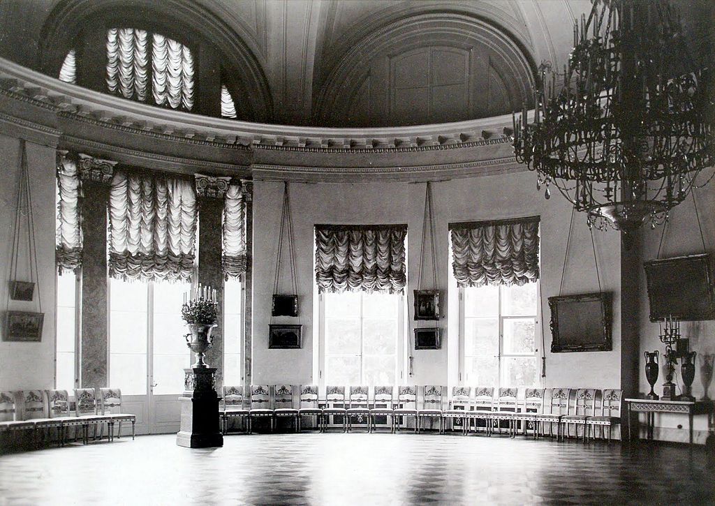 This is the center of the gala suite of rooms. This chamber had the least number of changes in the course of history and looks almost the same as Quarenghi made it. The walls of the room, like in the other two, are faced with shiny artificial marble. The hall gets its name from the apse, which is semi-circular and the central door leads onto the terrace overlooking the garden. Through these doors on August 1, 1917, the “Former Tsar’s Family” has left Alexander Palace forever. The leader of the Provisional government Alexander Kerensky exiled them to the city of Tobolsk in Siberia.